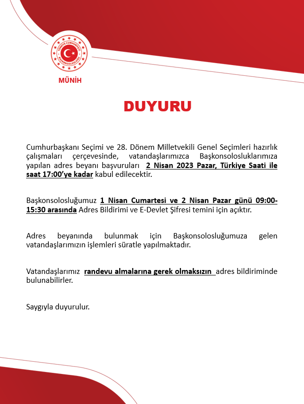 Başkonsolosluğumuz 1 Nisan Cumartesi ve 2 Nisan Pazar günü 09:00-15:30 arasında Adres Bildirimi ve E-Devlet Şifresi temini için açıktır.